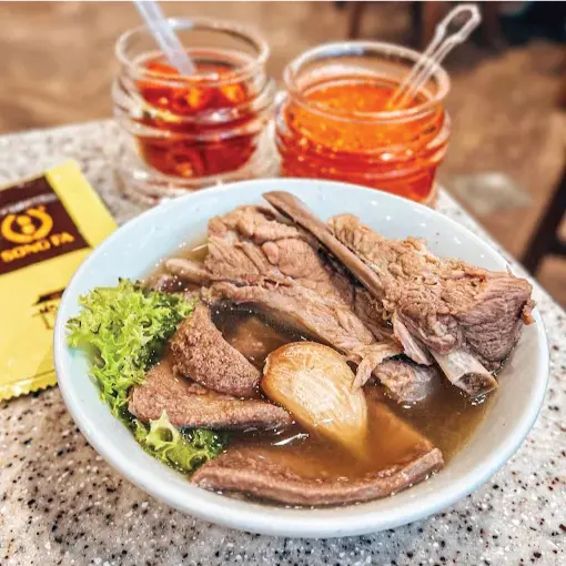 Bak Kut Teh means meat bone tea, though there is no tea in the soup. This peppery pork rib soup is slow simmered with garlic, white pepper and herbs until the meat is fall off the bone tender. Add rice, fried dough sticks and preserved vegetables for a hearty meal.